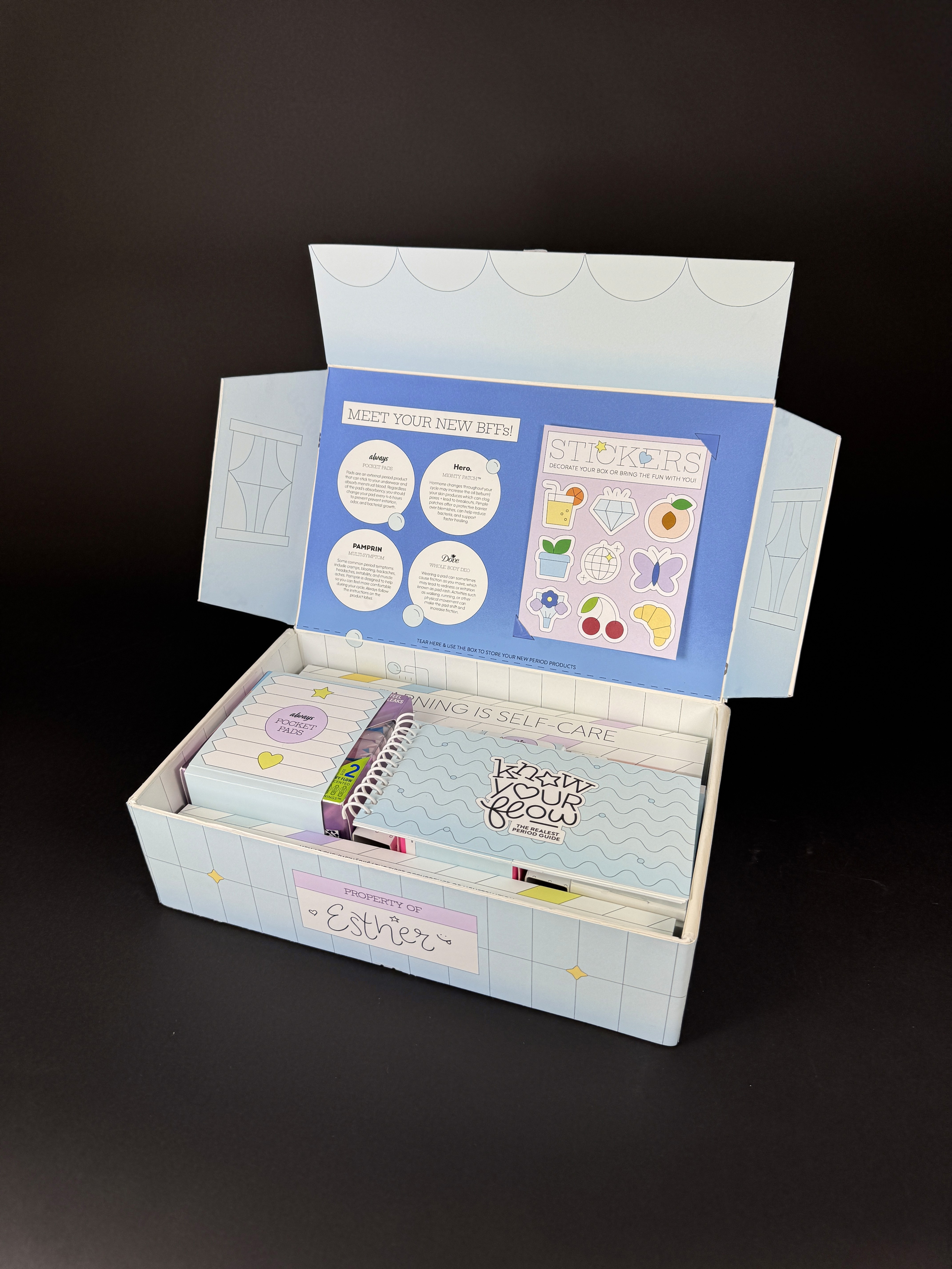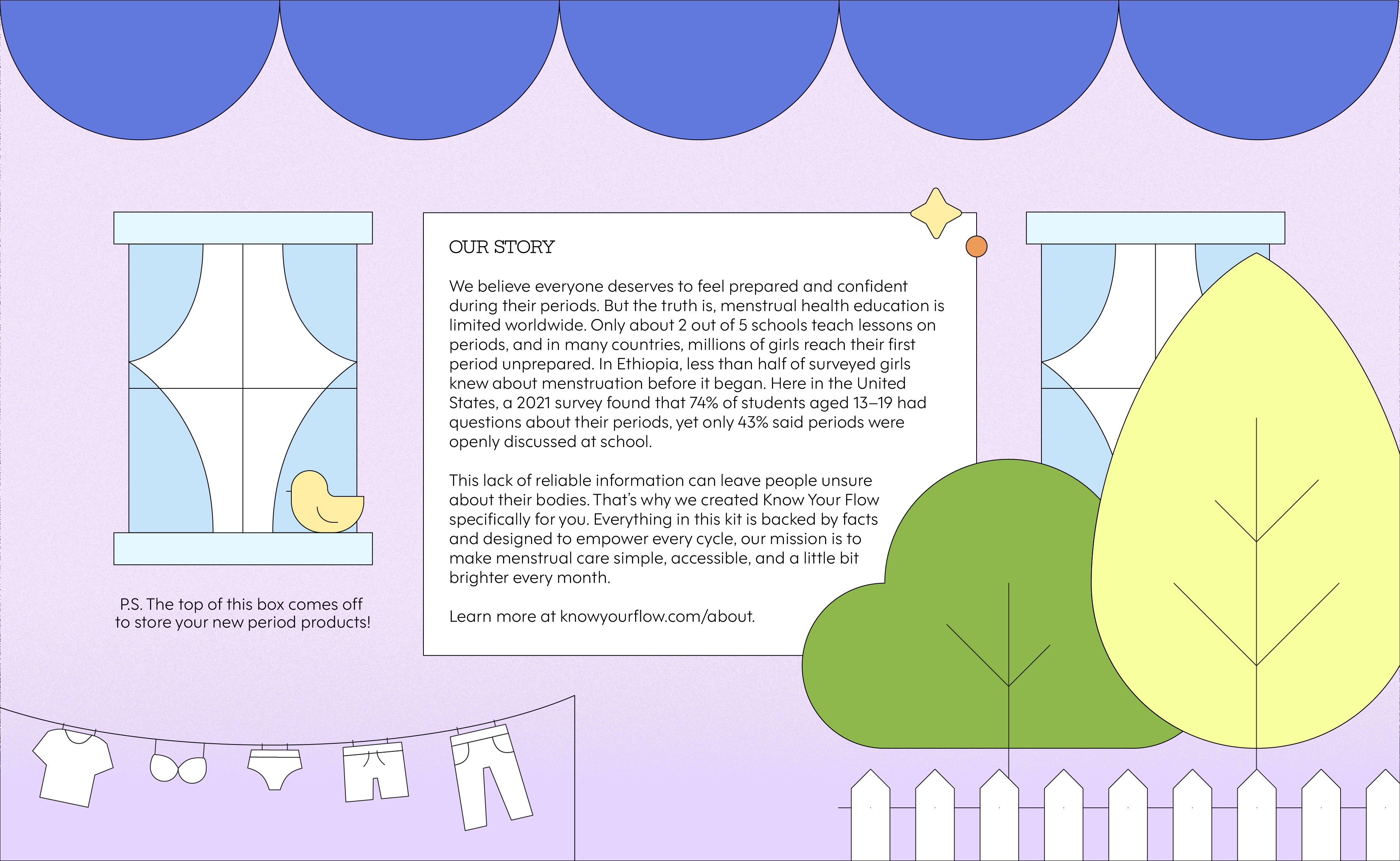 KNOW YOUR FLOW is a thoughtfully curated period kit designed to support first-time menstruators with research-backed essentials. Unlike brand-driven kits, each item is intentionally selected for its function and effectiveness. Paired with clear, educational guidance on how and why each product is used, the kit empowers users with knowledge while promoting an inclusive, stigma-free perspective on periods.